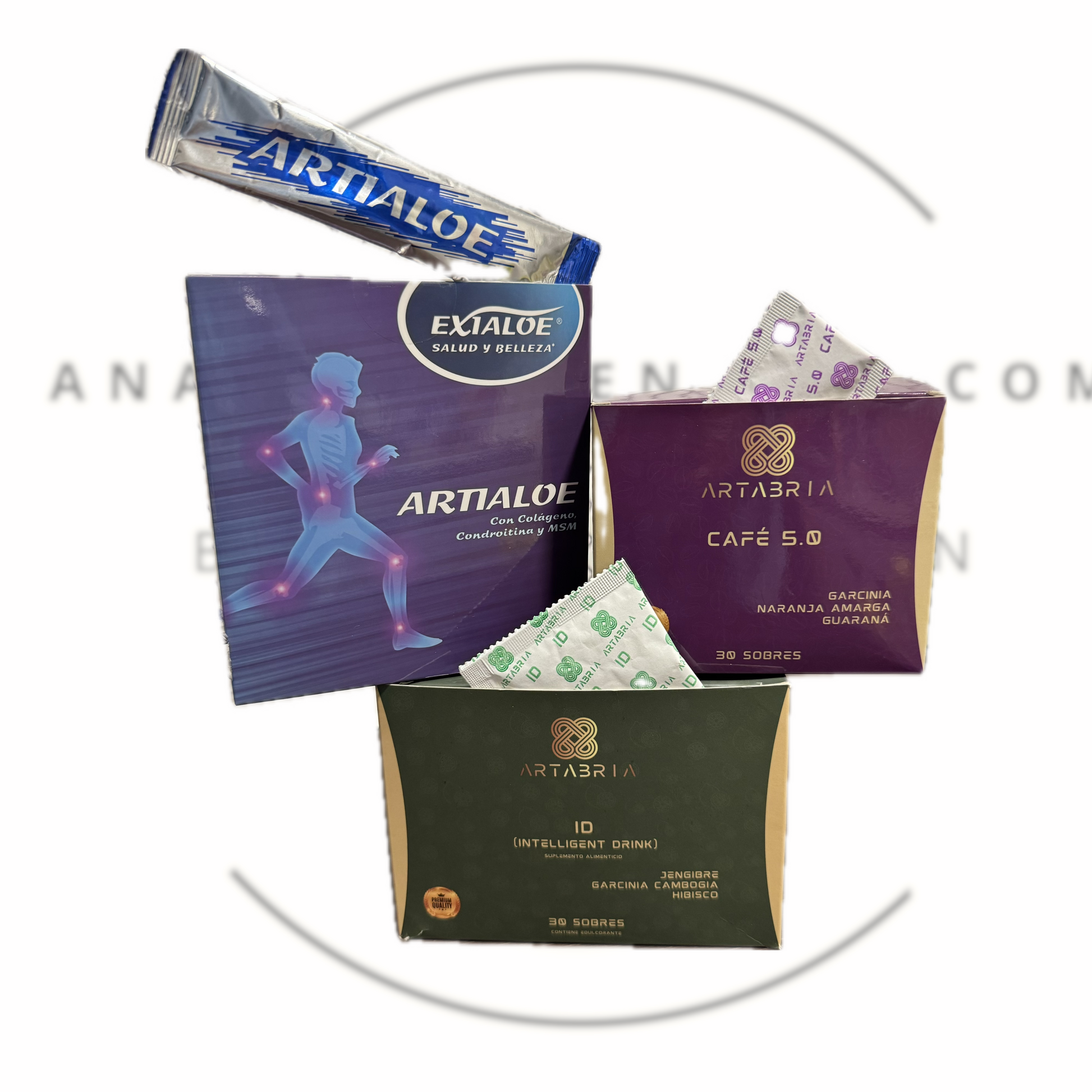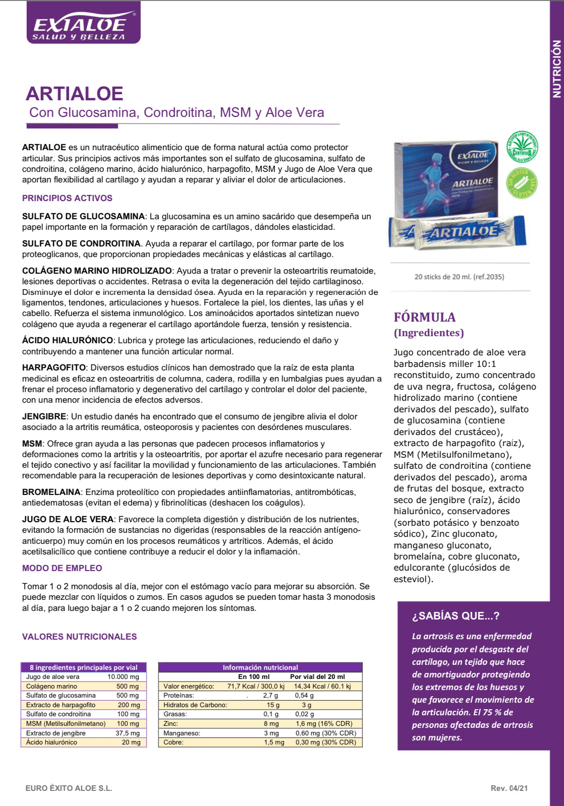 Artialoe es un complemento alimenticio líquido que de forma natural actúa sobre las articulaciones ayudando a mantener una buena movilidad por ingredientes como el harpagofito y el jengibre, contribuye al mantenimiento fuerte de los huesos por la acción del zinc y el manganeso, ayudando al mantenimiento de la elasticidad y flexibilidad gracias a la glucosamina y condroitina, además la glucosamina es también eficaz en la inflamación articular.